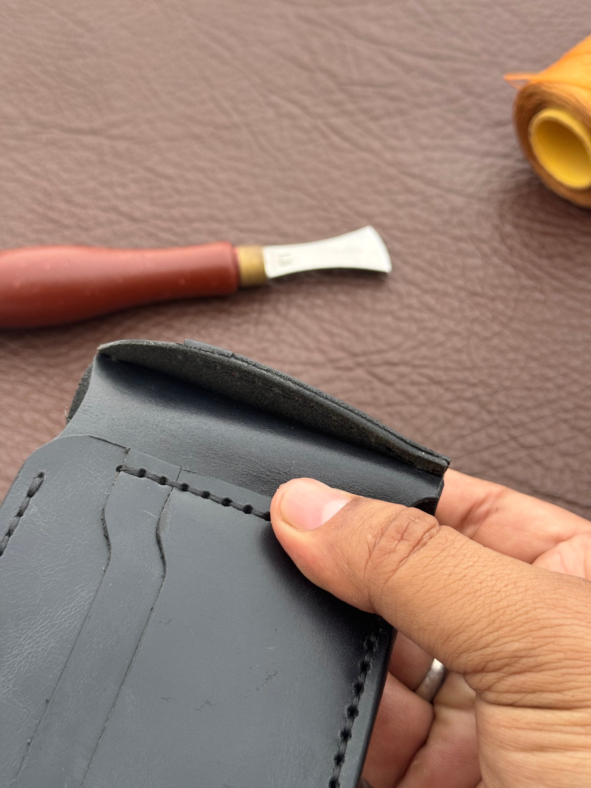 Stitching: Tonal Black/Dark Gray waxed thread.